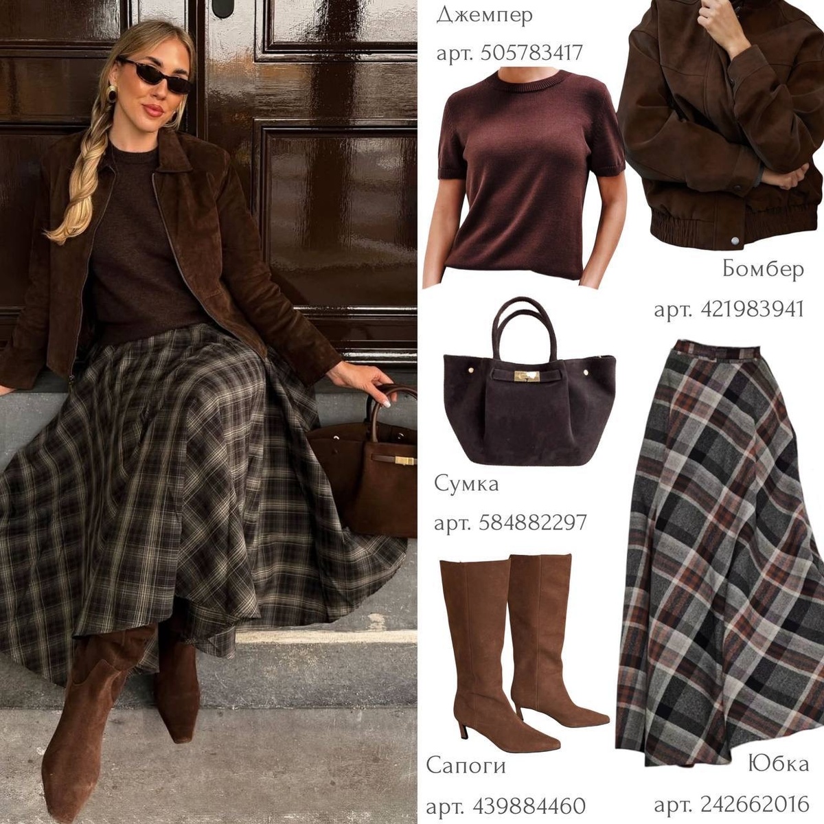 Глубокий коричневый джемпер в сочетании с юбкой миди в клетку создаёт утончённый и благородный образ. Тёплая палитра смотрится дорого и гармонично, особенно в сочетании с замшевыми сапогами на устойчивом каблуке.
