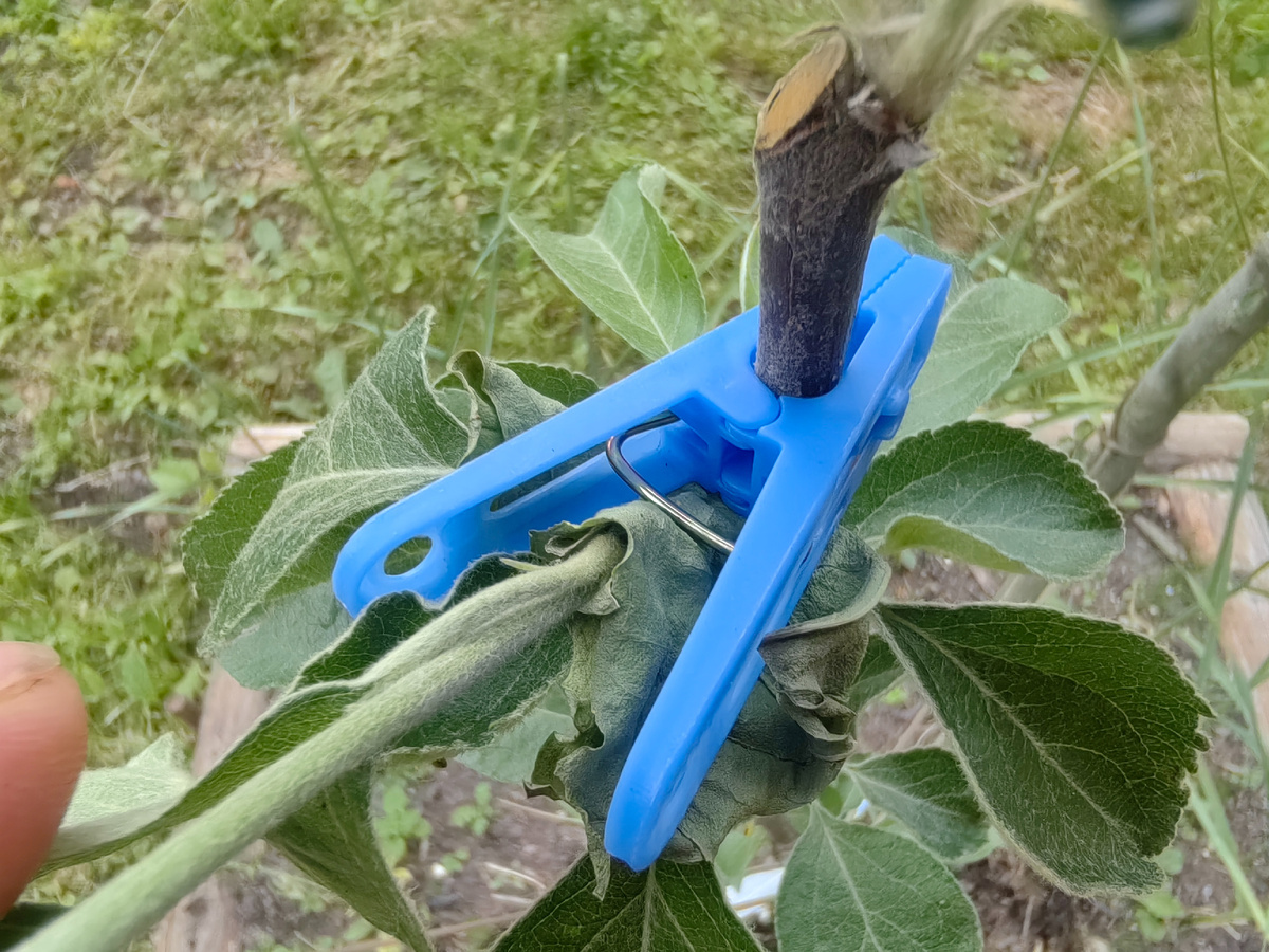 - Ещё не забывайте, что придать ветке форму гораздо легче в первый год её жизни, оттянув её или поставив распорку в нужном месте. Тут и риск отломить меньше, и положение нужное придать удобнее.