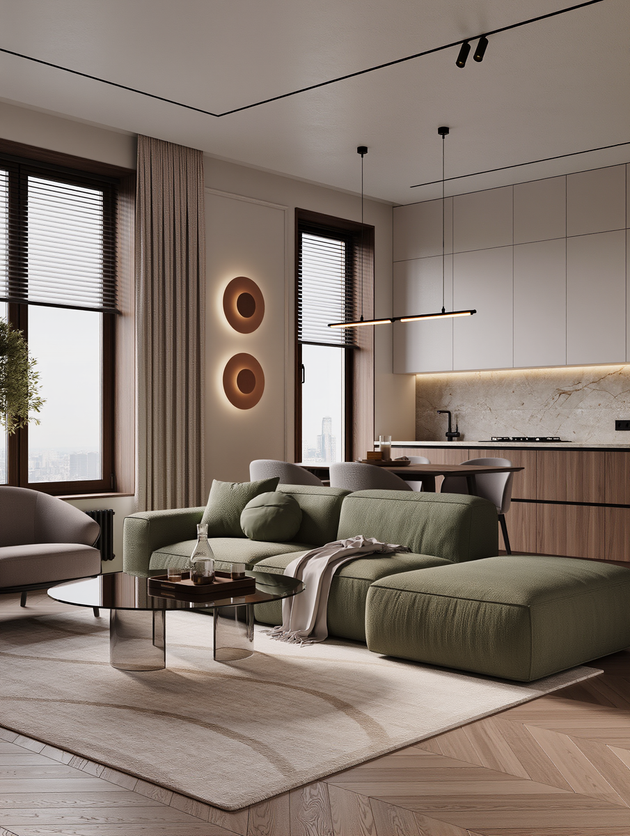 Главный герой пространства — приглушённый оливковый диван. Это не яркий зелёный, а сложный, природный оттенок с серым подтоном. Он добавляет глубину и делает интерьер живым, не нарушая общей спокойной атмосферы.