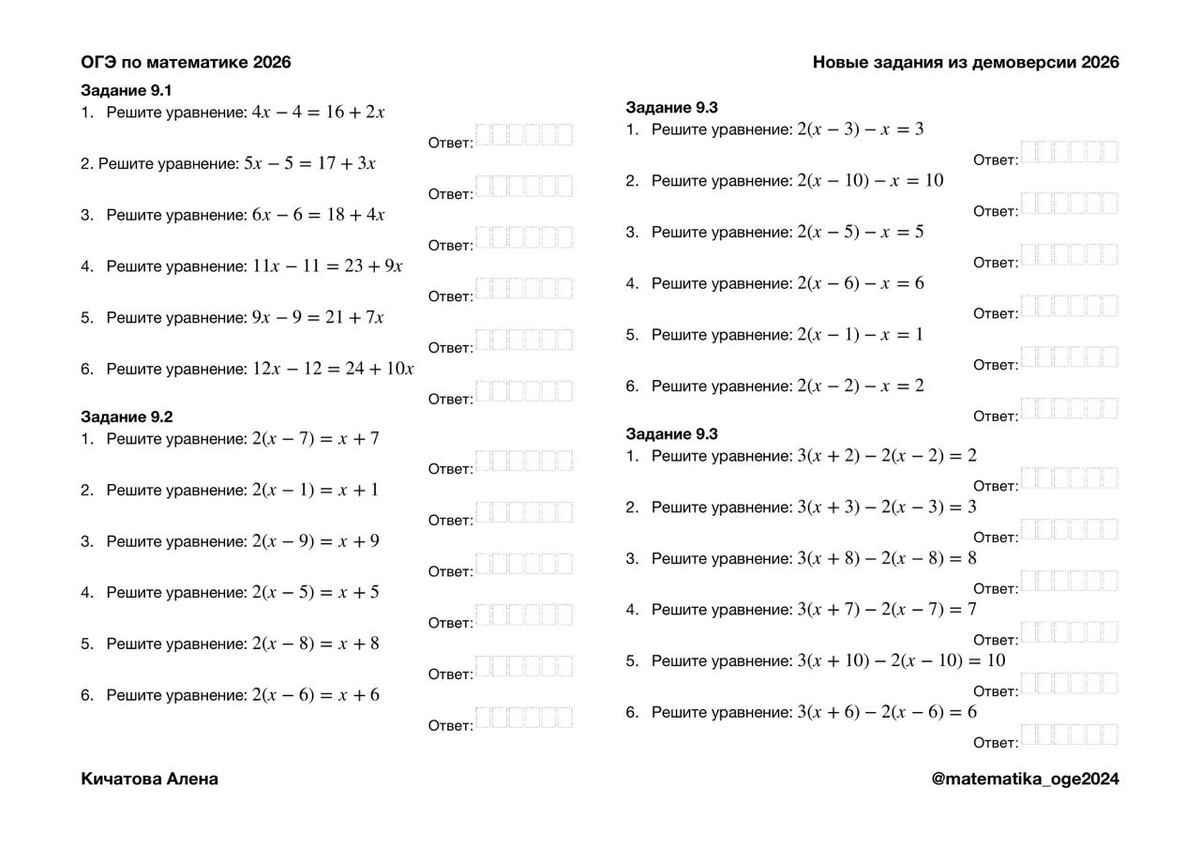 >> Собрала файлик со всеми новыми заданиями из алгебры для отработки Все новые типы из номера 9 и 10 с ФИПИ ⤵️ • 24 линейных уравнения разного уровня сложности • 6 заданий на вероятного по формуле • 6 заданий на вероятность с маркерами • 6 заданий на вероятность с двумя карандашами • 6 заданий на верность с кубиком • 6 заданий на дерево случайного опыта • 24 задания на диаграмму Эйлера Все новые задания здесь 🔗 Удобно для практики сейчас с учениками, чтобы закрепить все типы. Геометрию и 20 задание сделаю попозже вечером. Оставайтесь здесь 😌🙏🏻