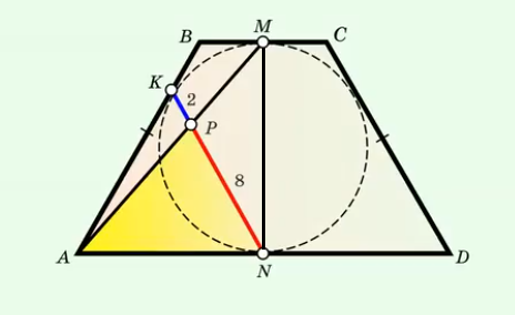 Рассмотрим решение задачи, которая на канале Валерия Казакова дана под заголовком Самая трудная задача на трапецию! Лучше сдайся. Итак, задача. 1. В равнобедренную трапецию ABCD, AB = CD, вписана окружность. Она касается сторон AB, BC, AD трапеции в точках K, M, N соответственно. Отрезки AM и KN пересекаются в точке P, KP = 2, PN = 8. Найдите площадь треугольника APN. Заключительный кадр решения выглядит так. Источник. Самая трудная задача на трапецию! Лучше сдайся | Наглядная Геометрия | Дзен https://dzen.ru/video/watch/699ed7f1c96e4e5333e708d2 Задача не так трудна, как кажется. Её можно решить с использованием меньшего числа геометрических фактов, повторив начальную часть решения. Решение. Проведём отрезок KM. Вписанный угол MKN – прямой, так как опирается на диаметр окружности. Проведём отрезок AO, где O – центр окружности. AK = AN по свойству касательных, проведённых из одной точки к окружности, AO – биссектриса угла A трапеции поэтому по свойству равнобедренного треугольника AO и