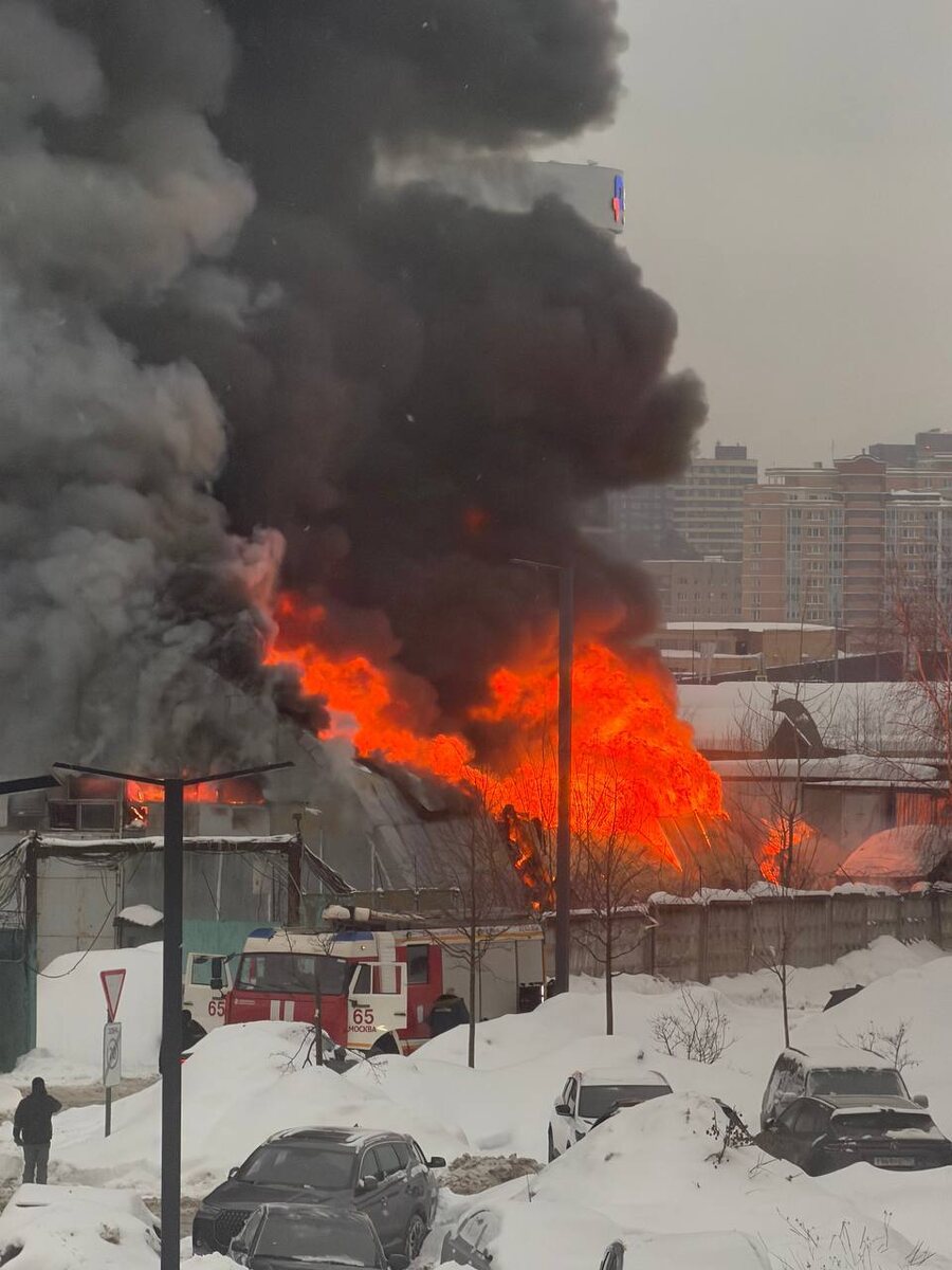 Около ЖК «Митино Парк» в Москве горит огромный ангар с газовыми баллонами