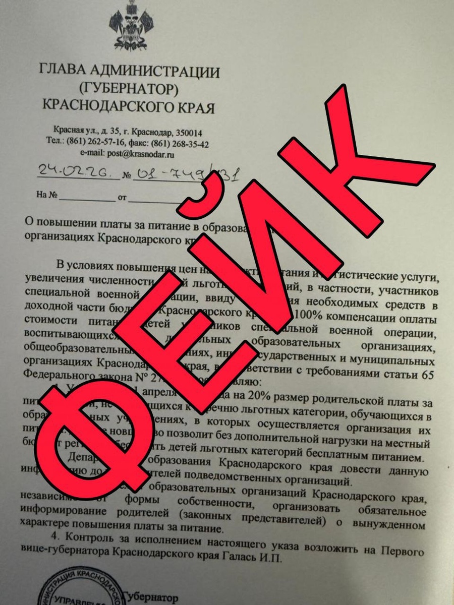 В Краснодарском крае опровергли распространяемую в мессенджерах информацию о якобы предстоящем повышении платы за школьное питание. Сообщения о том, что с 1 апреля 2026 года в образовательных учреждениях региона стоимость питания вырастет на 20% из-за увеличения числа детей льготных категорий, признаны недостоверными. Как сообщили в региональном оперативном штабе, в адрес администраторов телеграм-каналов, платформы MAX и редакций СМИ поступает поддельный документ, оформленный с грубыми нарушениями делопроизводственных норм. В частности, в тексте трижды упоминаются должности, которых не существует в структуре органов власти края. Речь идет о формулировках «глава администрации (губернатор) Краснодарского края», «первый вице-губернатор» и «департамент образования Краснодарского края». Подобные наименования не используются в официальных документах региона, что указывает на фальсификацию. В министерстве образования и науки края подчеркнули, что действующая система организации горячего питан