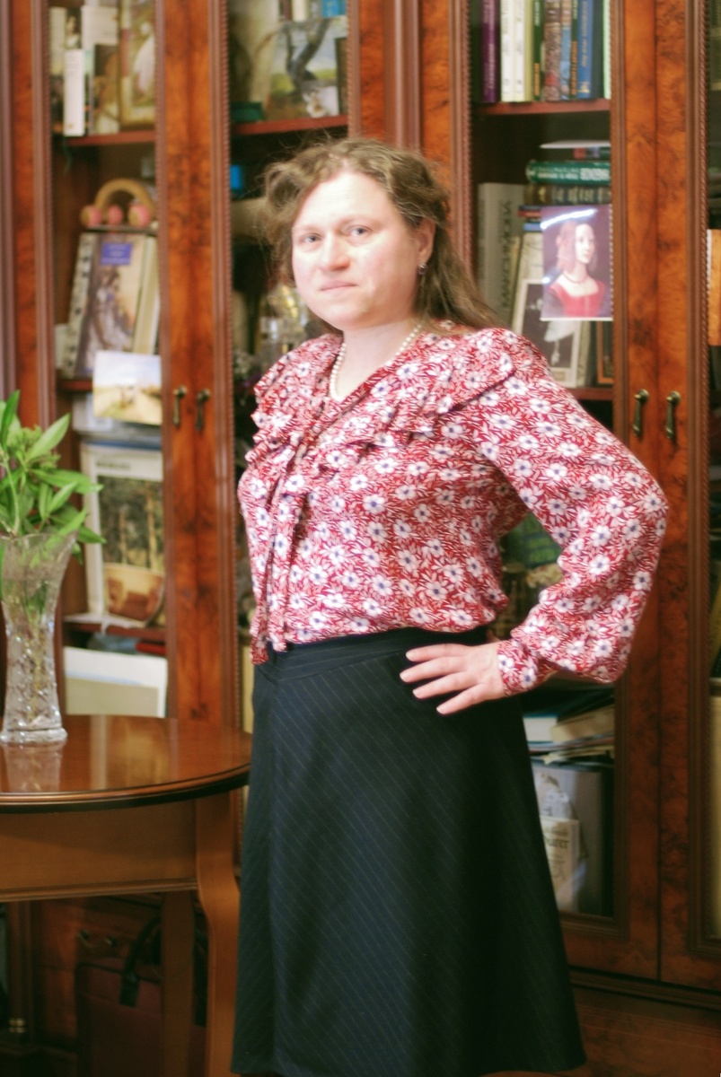 Юбка, которая началась с ошибки. У меня был метр чёрной шерстяной ткани в полоску. Я построила выкройку юбки-полусолнце, но вскоре обнаружила, что сделала ошибку в раскрое, - раскроила половину полусолнца, а больше ткани не было на вторую половину юбки. Я её покромсала, покромсала сверху, да и отложила. Делать соединение ткани по косой сзади, а спереди как прямая, - нет, такая простая юбка мне не интересна. (Мне интересна одежда, которая меня украсит и с изюминкой. К тому же, такого плана юбки я уже шила. А идея была сделать красивую встречу полос.) Отложила неудачный крой. Осенью, просматривая модели платьев и юбок 1930-х годов, я вдохновилась идеей соединить полосы по косой спереди, а соединить ткани по прямой спереди. Также я решила сделать юбку на кокетке. Кокетку накалывала на фигуре, с учётом сочетания полосок, потом подлаживала к ней юбку. Кокетка стала поясом-кокеткой, я старалась сделать более комплиментарно к моей фигуре и по вкусу. (К теме этой кокетки, возможно, верну