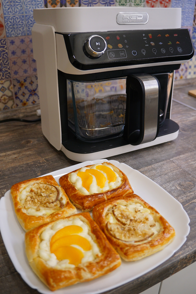 Я ценю рецепты, где не нужно долго стоять у плиты, а результат выглядит так, будто над ним трудились гораздо дольше. Эти слойки — как раз из этой категории. Минимум действий, простые продукты и аэрогриль, который берёт основную работу на себя. Такой десерт я спокойно могу приготовить утром к кофе или вечером, когда хочется чего-нибудь сладкого, но без лишней тяжести. Слоёное тесто я заранее размораживаю при комнатной температуре. Раскатывать его не нужно — мне важно сохранить толщину, чтобы слойки хорошо поднялись. Пласт теста делю на четыре одинаковых квадрата. В центре каждого квадрата ложкой аккуратно приминаю середину, формируя углубление для начинки. Совет: я стараюсь не продавить тесто до конца, иначе начинка может вытечь при выпечке. В миске соединяю творожный сыр и сахарную пудру, хорошо перемешиваю до однородной массы. Получившуюся начинку перекладываю в кондитерский мешок, а если его нет — в плотный полиэтиленовый пакет со срезанным уголком. Заполняю сыром углубления в