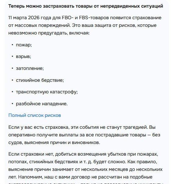 Проверьте, нужно ли вам это С 11 марта Ozon автоматически активирует страхование от «массовых повреждений» для FBO и FBS. Речь про: ✔ пожар ✔ затопление ✔ взрыв ✔ стихийные бедствия ✔ транспортные катастрофы ✔ разбой Партнёр — Ингосстрах. Тариф — 0,007% в день от стоимости товаров. Если у вас товар на 5 млн ₽ — это 350 ₽ в день. Списание — ежедневно. Услуга, по сути, полезная. Если склад сгорит — без страховки добиться компенсации будет крайне сложно. Но. Ozon, как обычно, подключает её автоматически. Чтобы отказаться — нужно самому зайти в «Финансы → Страхование» и убрать галочку до 11 марта. После 00:00 полис активируется на год и начнёт тарифицироваться. Моё мнение такое. Страхование — это нормально. Риски на складах реальные. Но формат «по умолчанию включили, если не хотите — отключайте сами» уже стал фирменным стилем площадки. Поэтому просто проверьте: ✔ нужна ли вам эта опция ✔ сходится ли экономика ✔ не увеличивает ли это и так растущую нагрузку И примите решени