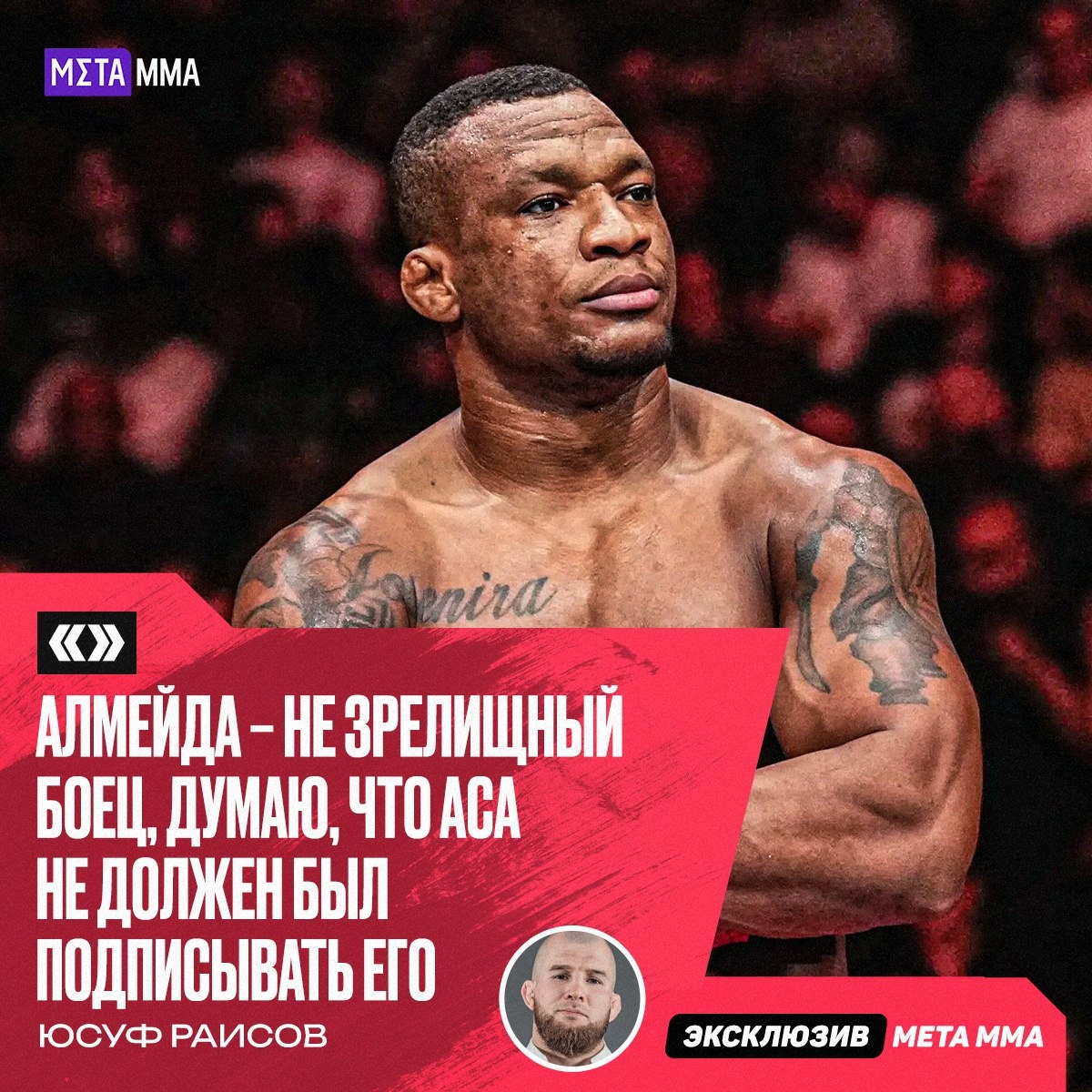 Российский боец Юсуф Раисов высказался о переходе Жаилтона Алмейды в лигу ACA, поставив под сомнение целесообразность этого решения «Я думаю, что руководство ACA все-таки поддается комментариям со стороны болельщиков. Если Алмейда не запросил какой-то космический гонорар, то подписание может быть оправданным. Но просто так подписывать бойца, который ушел из UFC, не выглядит резонным. Особенно на фоне того, что Жаилтон – незрелищный спортсмен. На основании многих факторов думаю, что руководство лиги не должно было подписывать Алмейду. Но, может быть, он себя как-то хорошо проявит в новой лиге», — сказал Раисов в интервью MMA.Metaratings.ru. ❓Согласны с мнением Раисова? 👇 👍 — Да, прав 🤔 — Уверен, что Алмейда удивит 👊 Подпишись на Meta MMA | Meta MMA в MAX | Наш канал в ВК