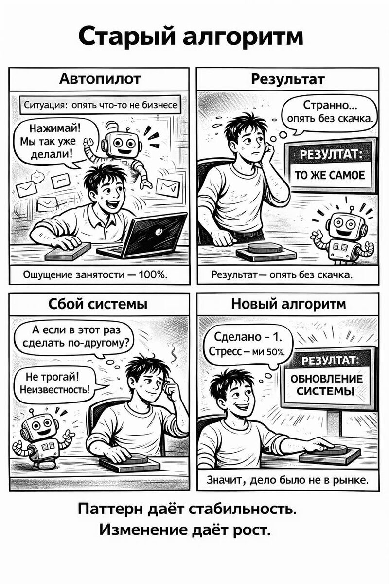 Вы знаете, что такое повторяющийся паттерн? Это когда один и тот же сценарий повторяется в похожих ситуациях. Вы прожили определённый опыт, сделали конкретные действия, мозг это зафиксировал. И в следующий раз, когда возникает похожая ситуация, включается тот же самый алгоритм. Часто автоматически, даже если это уже невыгодно. Я начал отслеживать у себя повторяющиеся действия и мысли. И задавать себе вопрос: а что если в этот раз подумать и поступить по-другому? Если нужен другой результат, значит и действовать нужно иначе. День начался с обучения команды по ИИ. Сегодня была вторая часть — показывал им то обучение, которое сам смотрел. Считаю, что эти навыки помогут команде в работе. Дальше созвон с управляющими собственной розницей. Закончили анализ конкурентов по ценам и сейчас выставляем новые цены. Где есть возможность — поднимаем, где нет — опускаем. Задача — выйти на плановую рентабельность. По каждой точке прописываем конкретные шаги (точки роста) для увеличения выручек, гд