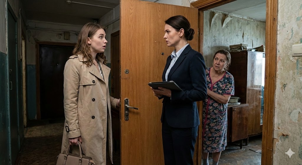 Когда створка распахнулась, Олеся замерла. Вместо располневшей родственницы в застиранном халате перед ней стояла женщина лет тридцати пяти. На ней был темно-синий брючный костюм идеального кроя, белоснежная блузка и туфли-лодочки, стоимость которых равнялась двум Олесиным зарплатам. Женщина держала в руке планшет, а её взгляд был настолько холодным и профессиональным, что Олеся невольно сделала шаг назад.