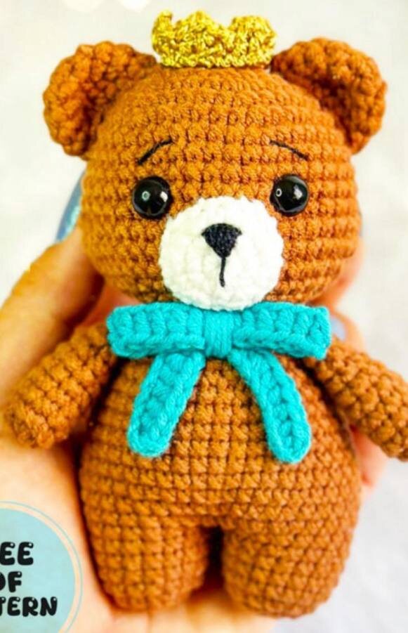 Мишка в короне и с бантиком на шее. Размер готовой игрушки - 13 см. Вяжется из коричневой пряжи, морда белая. Корона золотистая, бант синий (цвета можно менять). Схема простая, с пошаговыми инструкциями по сборке. Материалы • Пряжа амигуруми следующих цветов: • Коричневый – я использовала Balloon Amigo – Raiz 7762 Белый – я использовала Balloon Amigo – White 002 • Синий (для банта) – я использовала Balloon Amigo – Surf 8508 Желтый или золотой (для короны) – я использовала Encanto Slim • Более тонкая черная пряжа, для вышивки мордочки и бровей Крючок – я использовала 2,75 мм • Силиконизированное волокно для набивки • Глаза с замками 9 мм • Ножницы • Игла для гобелена *Цвета и пряжу можно менять по вкусу. Размер • Окончательное изделие, сотканное дизайнером с использованием предоставленных пряжи и иглы, составило 13 см. Поехали! Голова Коричневым цветом 1 . 6 сбн в MR 2 . 6 приб (12) 3 . (1 сбн, 1 приб) 6x (18)4 . (2 сбн, 1 приб) 6x (24) 5 . (3 сбн, 1 приб) 6x (30) 6 . (4 сбн, 1 приб) 6x