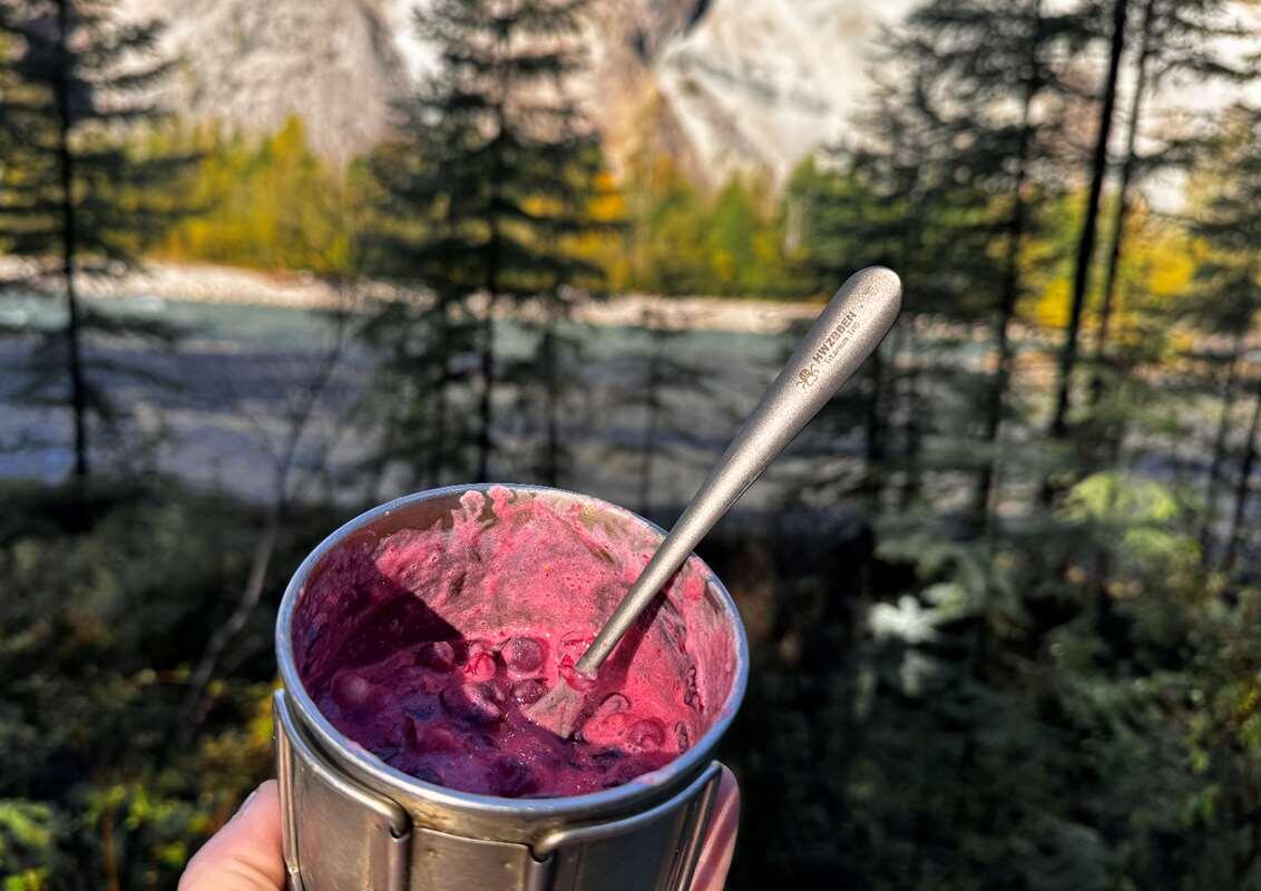 Вернёт Вас в детство Иногда со мной в походы идут любители сладкого. Поэтому специально для них припасён простейший рецепт, для которого понадобятся: кружка или сразу небольшая кастрюлька, брусника (250 граммов на 4 человек), сгущёнка (по вкусу, я кладу две столовые ложки на 100 граммов ягод), сахар (по вкусу, я кладу одну столовую ложку на 100 граммов брусники). Для того чтобы походный десерт получился нежным и вкусным, необходимо, чтобы ягоды, которые вы взяли, были спелыми и размороженными. Толочь в кружке или походной кастрюльке можно прямо ложкой, но можно взять и специальную мялку. Затем измельчённую массу лучше протереть через марлю или металлическое сито, чтобы отделить кожицу (она почти не переваривается). Дальше добавляем сгущённое молоко и тщательно перемешиваем, а сладость регулируем обычным сахаром. Если размешивали в кастрюльке, то можно разлить на порции в кружечки. Сладкое блюдо получается очень вкусным, витаминным и питательным, напоминая всем собравшимся детство. А зн