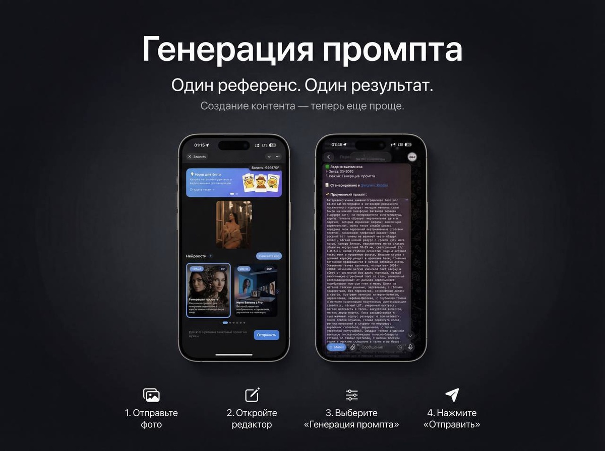 🍌 ✨ Как это работает • Загрузите понравившееся изображение — бот проанализирует его и создаст готовый промпт для повторной генерации. Идеально, если нужно создавать контент из референсных креативов — быстро, удобно и в одном месте. 🖥 🚀 Как начать 1️⃣Отправьте боту одно изображение 2️⃣ Откройте редактор и выберите "Генерация промпта" 3️⃣ Нажмите «Отправить» → получите готовый промпт Далее готовый промпт можно использовать для генерации контента со своим лицом.