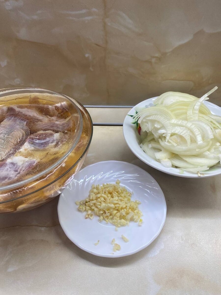 Пока рёбрышки плавают в пиве нарезаем 3 луковицы и 4-5 зубчиков чеснока.