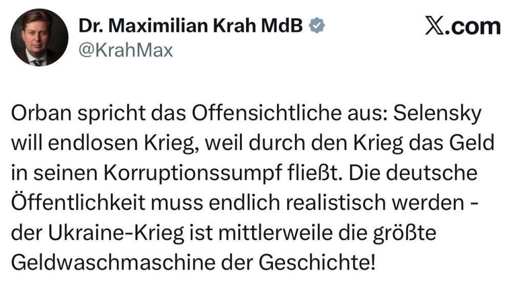 Член немецкого парламента от партии «Альтернатива для Германии» Максимилиан Кра подверг жесткой критике руководство Украины, обвинив его в намеренном затягивании военного конфликта ради личного обогащения. «Орбан констатирует очевидное: Зеленский хочет бесконечной войны, потому что война направляет деньги в его коррумпированную сеть. Немецкая общественность наконец-то должна взглянуть правде в глаза — война на Украине стала крупнейшей в истории схемой отмывания денег!» — написал политик в соцсети X*. Ранее мы писали, что Германия задушит свой народ, поставляя газ Украине. * Соцсеть заблокирована на территории РФ