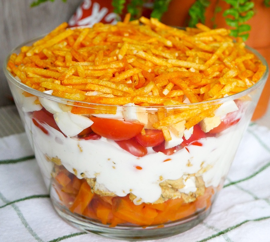 К любому праздничному столу, будь то 8 марта, на свой день рождения или просто с подружкой посидеть - приготовьте наши салатики, точно не пожалеете. Ингредиенты: 300 гр. куриной грудки 5-6 помидоров черри 4 яйца 2 моркови 5 столовых ложек сметаны или натурального йогурта 3 столовые ложки майонеза приправы для курицы соль перец 2 зубчика чеснока чипсы картофельные соломкой или жареный картофель, натертый на терке 1. Вымойте, очистите и нарежьте грудку кубиками. Приправьте любой приправой для курицы. Если ее нет, то просто посыпьте черным молотым перцем, паприкой и солью. Обжарьте на небольшом количестве жира до золотисто-коричневого цвета и отложите остывать.