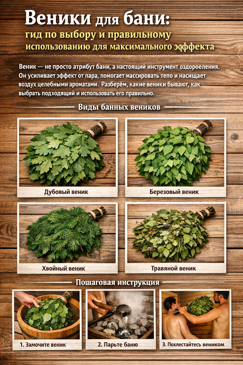«Правильный выбор веника и техника его использования превратят посещение бани в оздоровительную процедуру с максимальным эффектом. Сохраняйте эту статью как руководство и делитесь в комментариях: