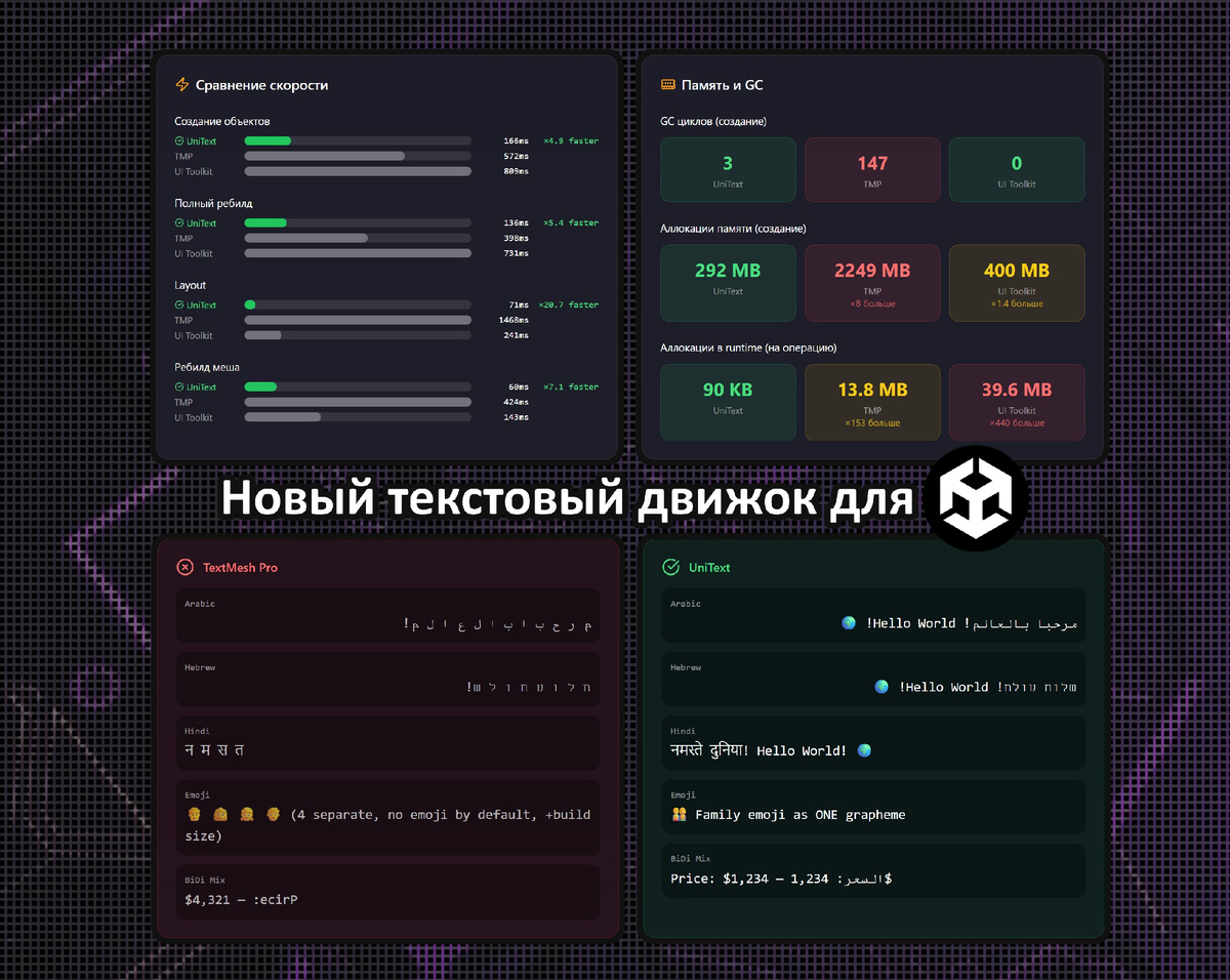 Встретил интересный пакет UniText. Это текстовый движок для Unity, по типу TextMeshPro. Но на базе HarfBuzz — того же, что используется во многих браузерах, софте и всяких ОС. Выглядит настолько хорошо, что похоже на скам. Но оно, по крайней мере, действительно работает. Лично пока всё проверить времени не хватает. Если кто уже успел, оставляйте фидбэк. Хоть оно и якобы эффективнее TMP, но пока кажется, что с визуальной настройкой есть свои неудобства и ограничения. Оф. сайт | Github | Документация ——————————— 🔸 100% поддержка Unicode, а это более 150 языков, в т.ч. арабский, иврит хинди и прочие иероглифы. 🔸 Поддержка двунаправленного текста (BiDi). 🔸 Поддержка системных нативных эмодзи, использование которых не увеличивает размер билда. 🔸 Поддержка цветных эмодзи (типа разного цвета кожи) и ZWJ (склейка нескольких эмодзи в одно). 🔸 Позволяет создавать кликабельные зоны в тексте с подсветкой при наведении. 🔸 Более 15 модульных модификаторов текста с возможностью создать свои. 🔸