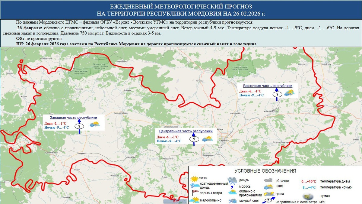 ☁️⛅⛈️ 26 февраля в Мордовии облачно с прояснениями, небольшой снег, местами умеренный снег с видимостью в осадках 3-5 км