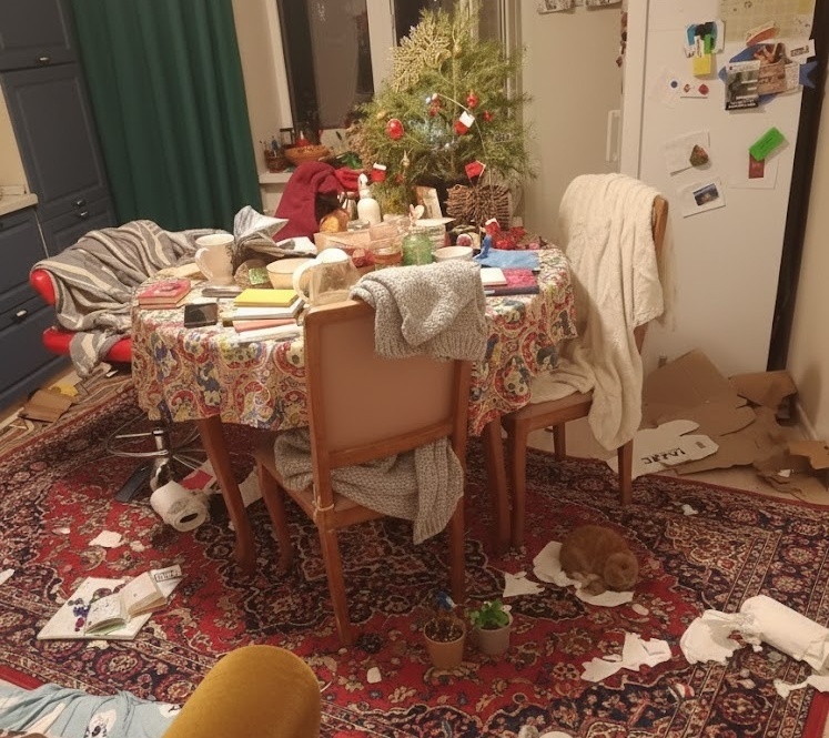 — Томочка, проходи, дорогая, не разувайся, у нас не прибрано. Я чайник поставила, сейчас чаю попьем. Она легким движением руки, будто крошки со стола, сгребает в кучу липкие кружки с засохшим чаем, пачку чеков и ворох пакетов. Сверху на эту баррикаду летит свитер дочки — прямо в тарелку с недоеденным печеньем. Садись, Томусь, сейчас чайку сообразим. Я глянула в зал, а там фикус в три погибели согнулся под тяжестью сушащихся носков. На кухне в раковине посуда уже в тр