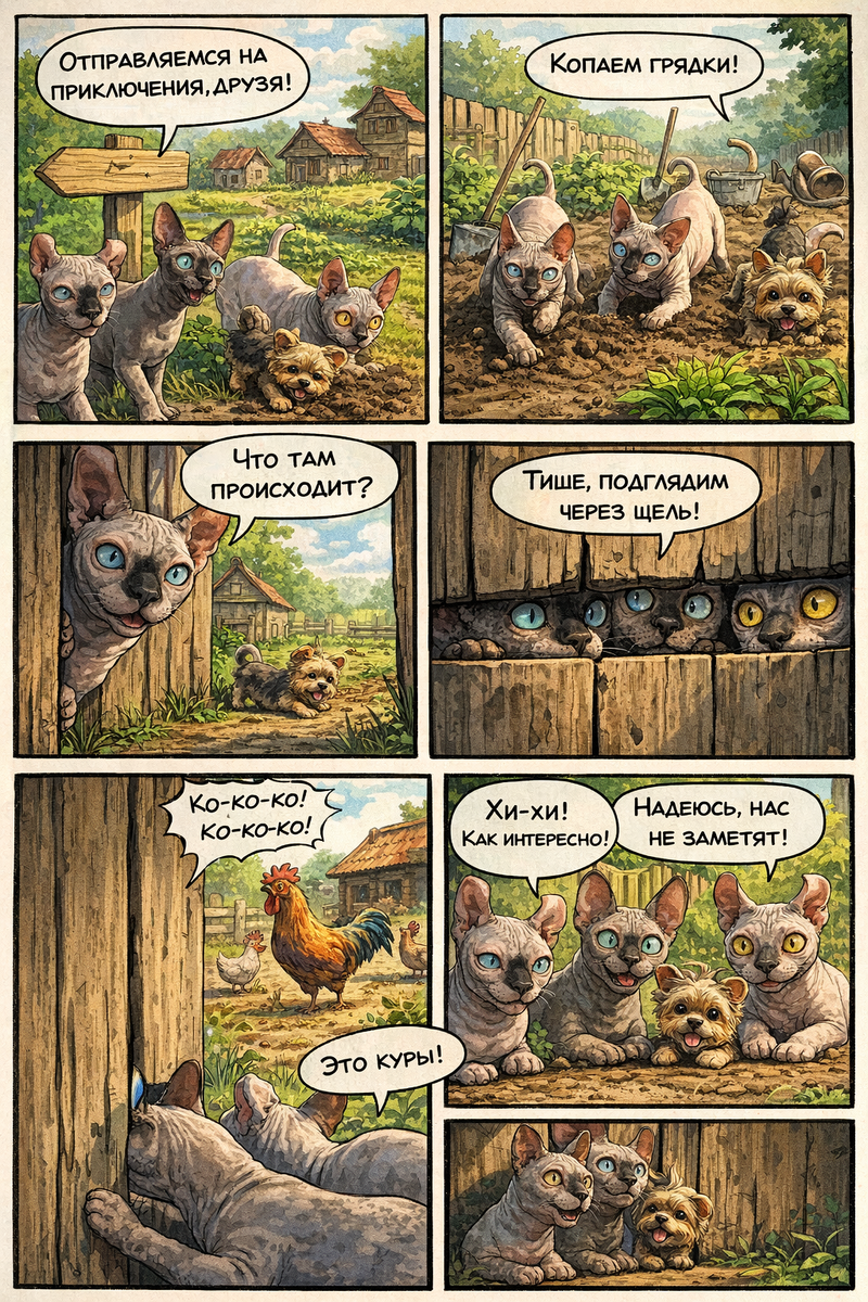 Первым вышел Людвиг. Как истинный канадский сфинкс, он выглядел как очень умное, но сильно помятое колено философа. За ним, крутя загнутыми ушами, семенил я, Олаф — эльф, чей вид внушал курам священный трепет и желание немедленно уволиться из несушек.Замыкала шествие Таисия. Будучи двэльфом, она сочетала в себе короткие лапки и эльфийские уши, из-за чего напоминала бархатный кабачок на низком ходу.