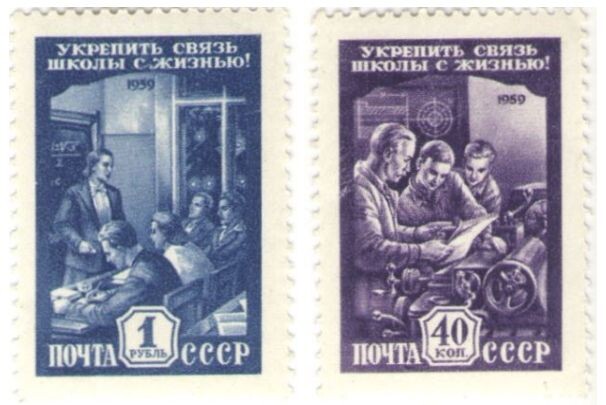 Вот тогда (1959 г.) и появились две марки об этом событии. На них - школьники в токарной мастерской и взрослые ученики в вечерней школе. Обе миниатюры объединяет лозунг «Укрепить связь школы с жизнью!».
