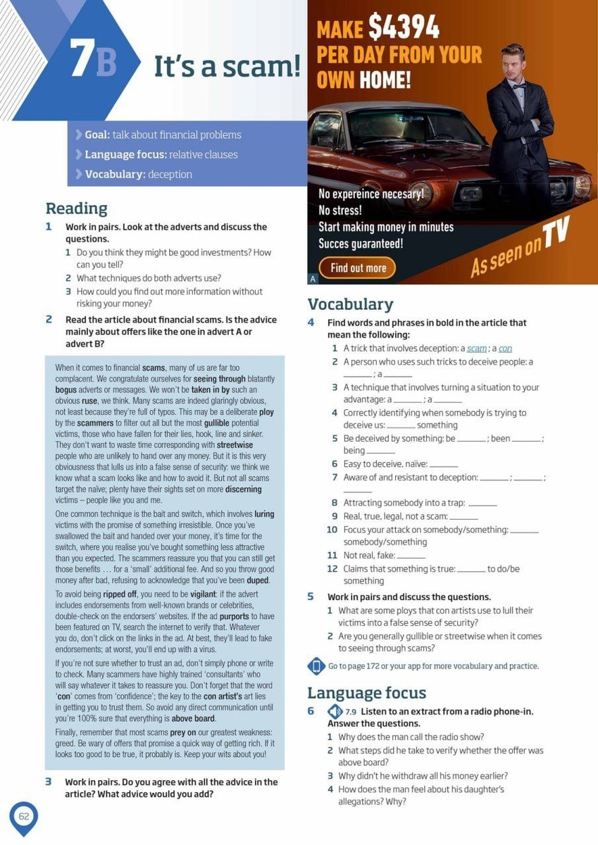 С ученицей идем по Roadmap C1. В 9м юните попадается крайне лексически насыщенный текст про финансовых мошенников. Можно, конечно, было бы сделать просто reading for gist и пойти дальше, но мне это не интересно. Моя цель была - сделать так, чтобы студентка могла бы говорить о собственном опыте в рамках данной темы с использованием лексики учебника. Длительность урока всего 40 минут, поэтому решено было обсуждать лишь один параграф текста учебника. Структура урока стандартная. 1) Разглядываем картинки, подводим к теме мошенничества.
