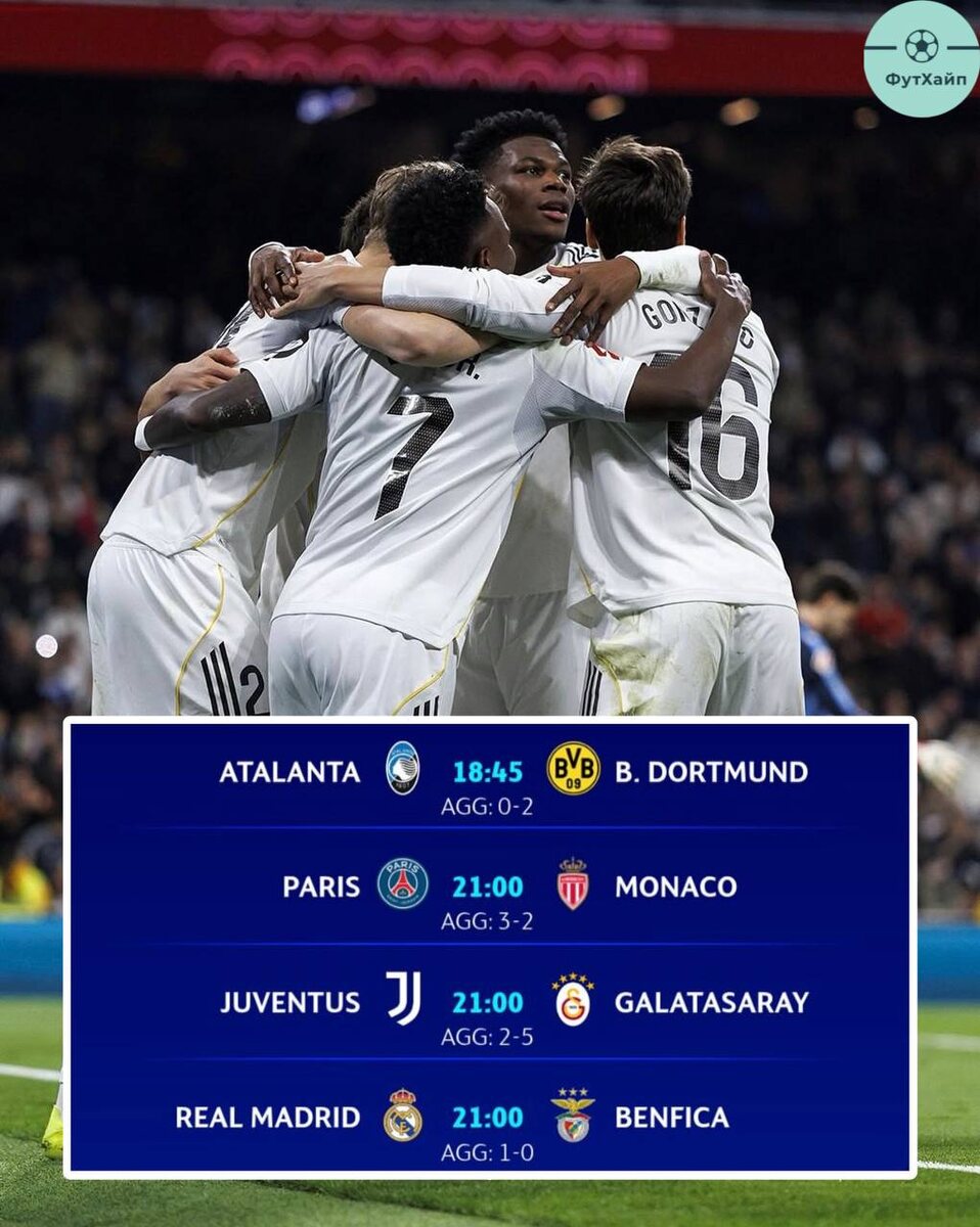 Обсуждали в эфире #вечерний_футхайп потенциальные шансы на все игры. Кратко напишу свои мысли: 🟡Не верю в Аталанту вообще, думаю Боруссия спокойно сегодня не проиграет и пройдет дальше 🟡ПСЖ должны легко сегодня побеждать с разницей в 2-3 мяча 🟡Реал как по мне фаворит на выход, Бенфике будет трудно, хотя 100% пободаются 🟡Хотелось бы офигенного камбэка от Юве, но скорее всего либо минимально победят, либо турки не проиграют Что думаете по сегодняшним матчам? Пишите с чем согласны, а с чем нет 👇👇👇 ➡️ Подписаться на ФутХайп