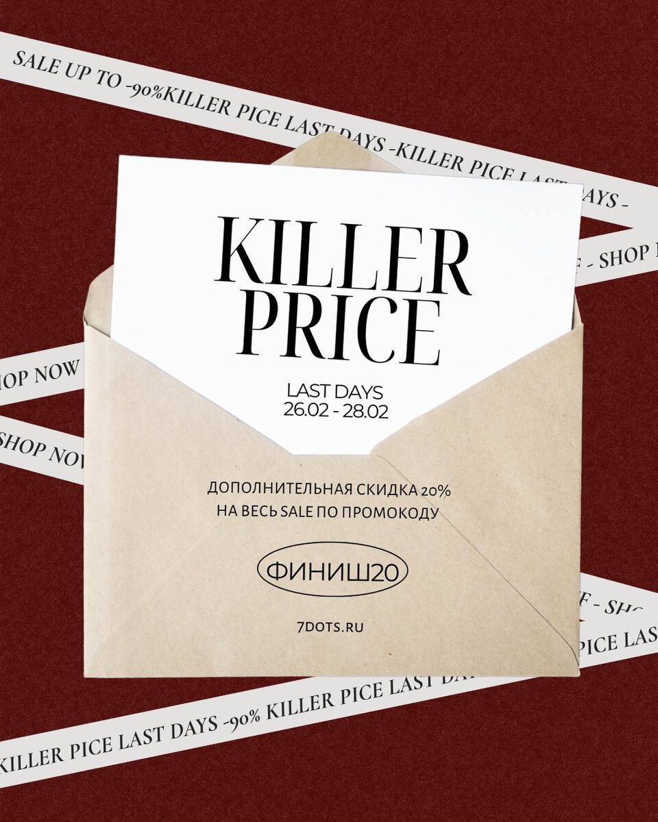 Финальные дни KILLER PRICE! С 26.02 до 28.02 включительно дарим дополнительную скидку 20% на весь SALE по промокоду „ФИНИШ20“. Первыми ознакомиться с ассортиментом, вошедшим в распродажу, и сделать заказа можно на нашем сайте в разделе “SALE” 26 февраля 00:00!