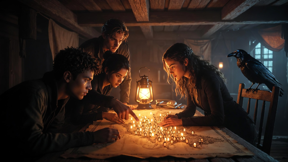 Карта лежала на столе в домике Алисы, занимая почти всю поверхность. Она была живой — сотканная из тончайших шёлковых нитей и чернильных линий, она пульсировала мягким светом, и на ней, как звёзды на ночном небе, горели десятки огоньков. Алиса, Даниил и Надя склонились над ней, разглядывая это невиданное зрелище. Ворон устроился на спинке стула и тоже делал вид, что изучает карту, хотя на самом деле просто хотел быть поближе к компании. — Сколько их? — прошептала Надя, благоговейно касаясь пальцем одного из огоньков. Тот вспыхнул ярче, и в воздухе возникло крошечное изображение — лицо пожилой женщины, сидящей у окна. — Это она? — ахнул Даниил. — Мы можем её увидеть? — Можем, — кивнула Алиса. — Карта показывает не только место, но и человека. Садовники вложили в неё всю свою мудрость. Арх, стоявший рядом, подтвердил: — Каждый огонёк — это тот, кто хотя бы раз видел Сад. Во сне, наяву, через конверт, через случайное видение. Элиан касался их всех, сеял семена. Теперь ваша задача — собрат
