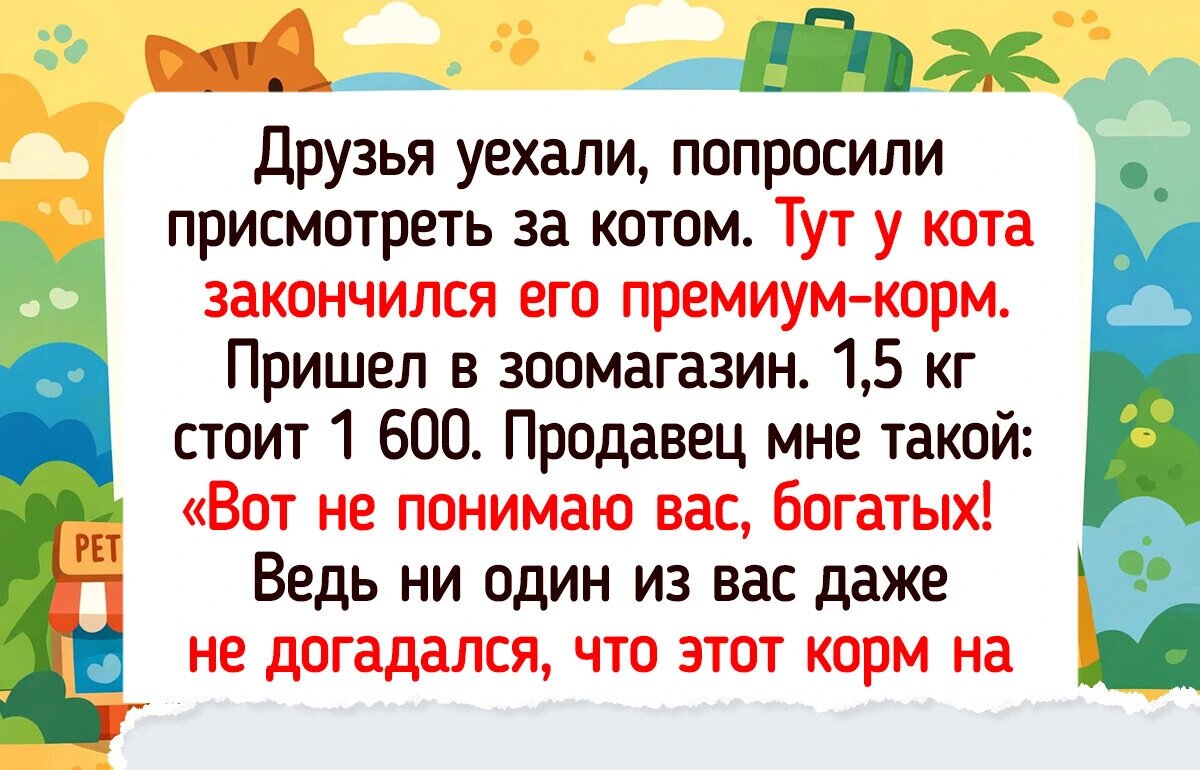 - Друзья уехали, попросили присмотреть за котом. У кота закончился премиум-корм. Пришёл в зоомагазин: 1,5 кг стоит 1600. Продавец: «Не понимаю вас, богатых! Никто даже не догадался, что этот корм на развес выгоднее. Килограмм развесного — 580. В два раза дешевле!» Действительно. Взял килограмм на развес. На разницу в 1000 набрал себе разных приколюшек. Всем бы таких продавцов.