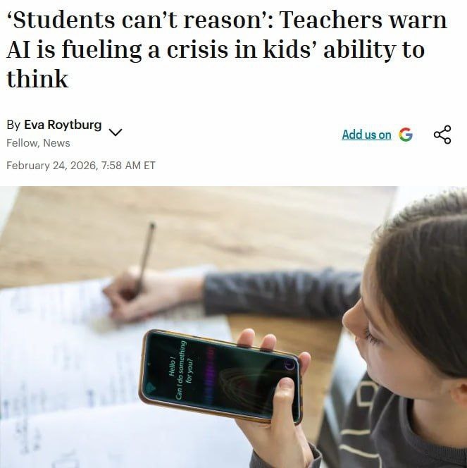 Помните страшилки, что ИИ отупляет человечество? Кажется, мы уже не в начале этого пути, а на финишной прямой. Исследователи из Брукингского института обнародовали пугающие данные. Массовое внедрение нейросетей в школах всего за три года привело к тому, что ученые называют «когнитивной атрофией». Что это значит на практике? 🧠 Дети разучились читать. Да, они могут пробежать глазами, но вдумчивое чтение длинных текстов исчезло. ✍️ Они не могут писать сами. Написать пару абзацев без ChatGPT — непосильная задача. 📚 Амнезия. Школьники не помнят, о чем писали в своих работах несколько дней назад. Зачем запоминать, если нейросеть все сгенерировала? 🤖 Вера роботу. Критическое мышление атрофировалось быстрее всего. Если это написал ИИ — значит, это истина в последней инстанции. Мы получили поколение, которое умеет формулировать промпты, но не умеет формулировать мысли. И это не футурология, а отчет за 2026 год. Что будем делать? #ИИ #Образование #Дети #КогнитивныеНавыки #Будущее