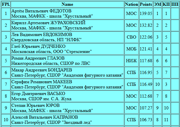 Тренирующийся у мамы с папой Лев Евдокимов (122.06 - 3 место) стал одним из четырех исполнителей каскада 3+3 аксель-тулуп в короткой программе. Напомню, что по 1 сп. разряду тройной аксель в КП как у девочек, так и у мальчиков, является "каскадным" прыжком. А еще на этом турнире предусмотрен бонус (+1 балл) за исполнение каждого прыжка ультра-си в короткой и произвольной программе. Все шло в короткой программе Льва по плану, но тут случилось обидное падение на дорожке шагов, которое практически ее обнулило. Ничего страшного, даже с такой ошибкой Лев стал пятым в короткой программе и остается третьим по сумме.