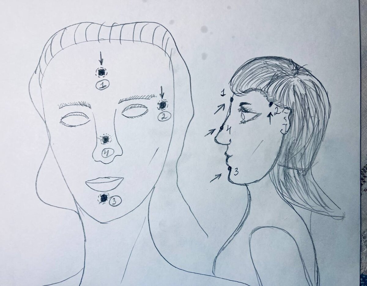 Точки обозначены на рисунке жирными чёрными точками обведенными прерывистой линией. Рядом номера в кружочках. Для удобства нарисовал фас и профиль. Итак 1 Точка здоровья всей головы: При её массаже, акупунктуре и просто разминании расслабляются поверхностные и глубокие фасции головы, улучшается лимфодренаж. Волшебная она потому, что в этом центре сходятся фасциальнве и энергетические меридианы. Эффекты: уменьшения головной боли, застоев лимфы, отеков. 2 Виски - с обеих сторон. Массажируются одновременно или попеременно с целью улучшения лимфооттока, снижения внутричерепного давления, снятия головных болей, спазма в глазах и много чего ещё. 3 Под нижней губой Снимается напряжение с челюстей (например перед или после длительного разговора полезно её помассажировать, чтобы не заболела голова). 4 точка в центре носа, где идёт переход от косточки к хрящу (от твердого к мягкому и подвижному) Воздействует на головной мозг и передние центры. Улучшает кровообращение лба, снимает головны