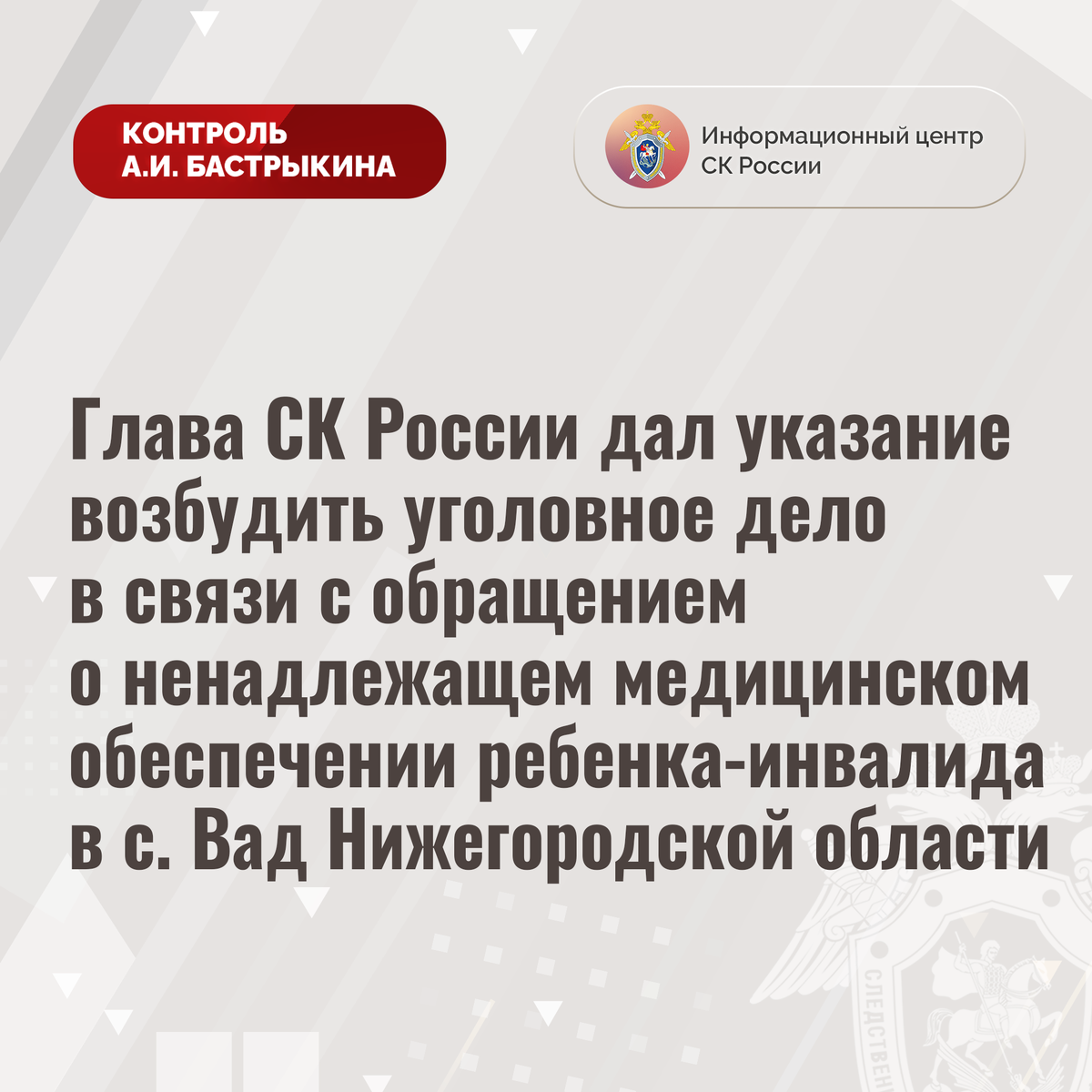 Глава СК России дал указание возбудить уголовное дело в связи с обращением о ненадлежащем медицинском обеспечении ребенка-инвалида в с. Вад Нижегородской области В Информационный центр СК России поступило обращение жительницы села Вад Нижегородской области по вопросу нарушения прав ее двенадцатилетней дочери-инвалида, страдающей сахарным диабетом, на качественное медицинское обеспечение. Ранее девочке предоставлялись сенсоры непрерывного мониторинга уровня глюкозы в крови, в связи с неисправностью которых и возникновением у малолетней аллергической реакции компетентными органами принято решение о замене датчиков. Вместе с тем в текущем году необходимые медицинские изделия ей не выдаются. Обращения матери в различные инстанции результатов не принесли. В СУ СК России по Нижегородской области организована процессуальная проверка. Председатель Следственного комитета Российской Федерации Александр Иванович Бастрыкин дал указание руководителю СУ СК России по Нижегородской области Айрату Сает