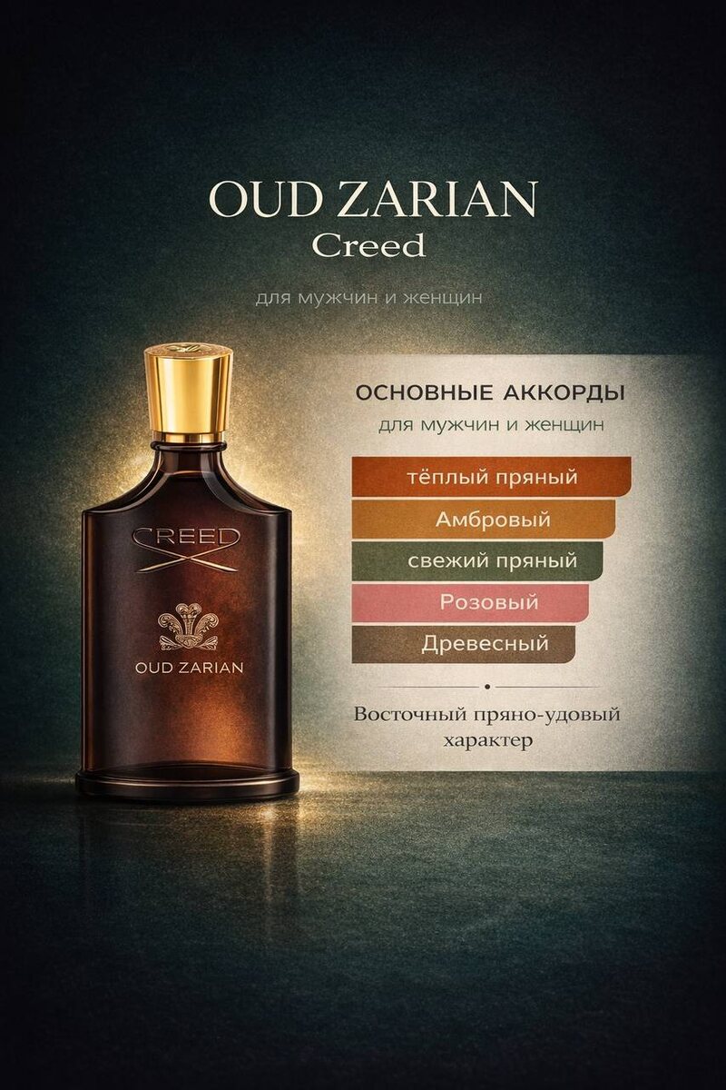 Есть ароматы, которые просто приятно пахнут. А есть те, которые создают вокруг вас атмосферу силы, глубины и статуса. Oud Zarian от Creed — как раз из второй категории. Это тёплый пряный уд с розой и смолами. Глубокий. Бархатный. Восточный. Без крика. Без дешёвой сладости. С характером. С первых нот — пряности и лёгкая дымность. Дальше — роза, но не цветочная, а густая, тёплая, вплетённая в смолы. В базе — уд, амбра, древесина. Тяжёлый, статусный фундамент. Это аромат, который не суетится. Он спокойно занимает пространство. ⸻ Кому он особенно зайдёт? Если вам нравится: • Ombre Nomade — за густой, тёмный уд • Oud Satin Mood Extrait — за розово-смоляную глубину • Oud for Greatness — за мощный пряный характер — Oud Zarian точно попадёт в ваше настроение. Он стоит где-то между ними. Менее агрессивный, чем Oud for Greatness. Менее сладкий, чем Oud Satin Mood. Менее дымный, чем Ombre Nomade. Но при этом — узнаваемо нишевый и статусный. ⸻ Это аромат для: ▪️ вечерних выходов ▪️