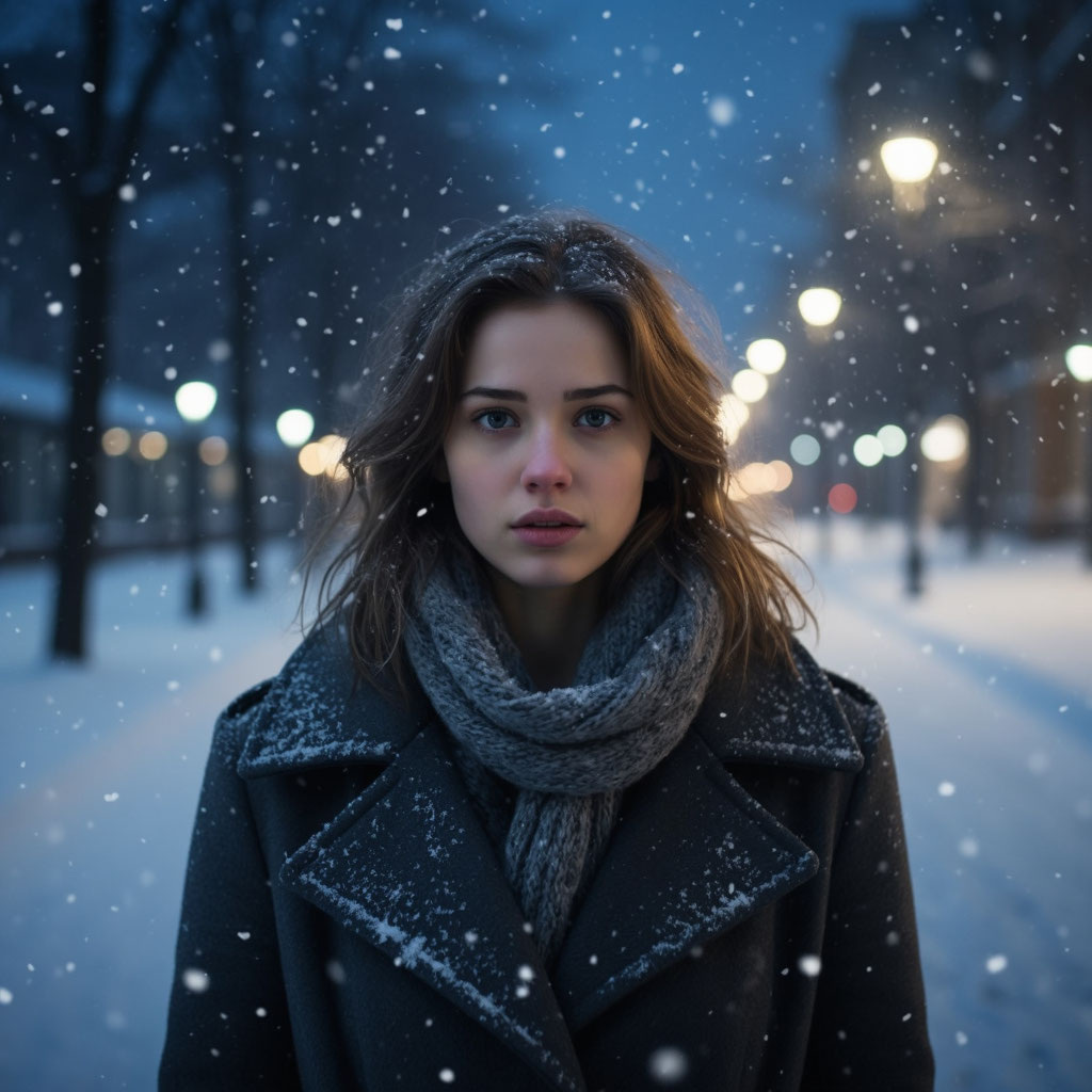 Зимний вечер опускался на город, укутывая улицы плотным снежным покрывалом. Время будто замедлило ход: фонари, расставленные вдоль тротуаров, разливали желтоватый свет, превращая падающие снежинки в крошечные золотые искорки. Воздух был пронизан морозной свежестью, а тишина — та особенная, что бывает только в первые часы снегопада — казалась почти осязаемой.