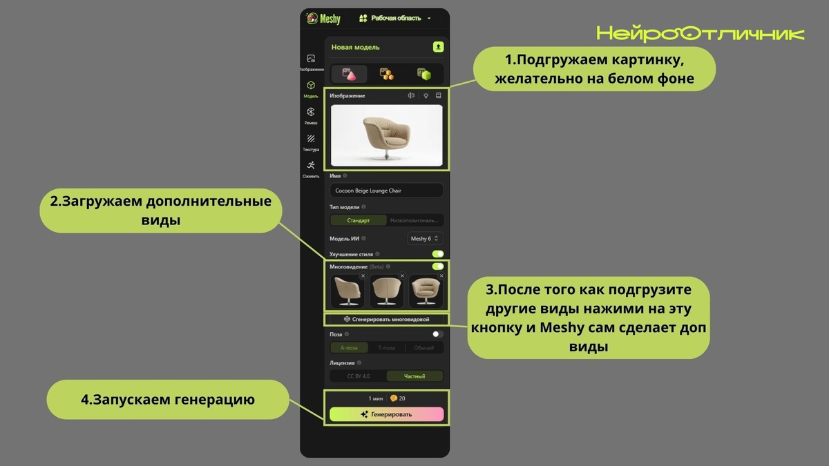 3D-моделирование стало проще: Meshy внедрил функцию загрузки нескольких ракурсов для Nano Banana. Теперь нейросеть не фантазирует детали — вы получаете реально точную 3D-модель без "сюрпризов" сзади. Преимущества: • Несколько углов — никакой самодеятельности алгоритма • Крутая детализация: PBR-материалы, карты нормалей, чёткая геометрия • Поверхности стали ровнее • Идеально для быстрых прототипов В ближайших обновлениях появится редактор деталей. А пока можно сгенерировать изображение через Nano Banana, а потом построить 3D. Впечатлило? Делитесь своим опытом и подписывайтесь! #3Dмоделирование #нейросети #Meshy #технологии Нейро Отличник www.neurootlichnik.ru