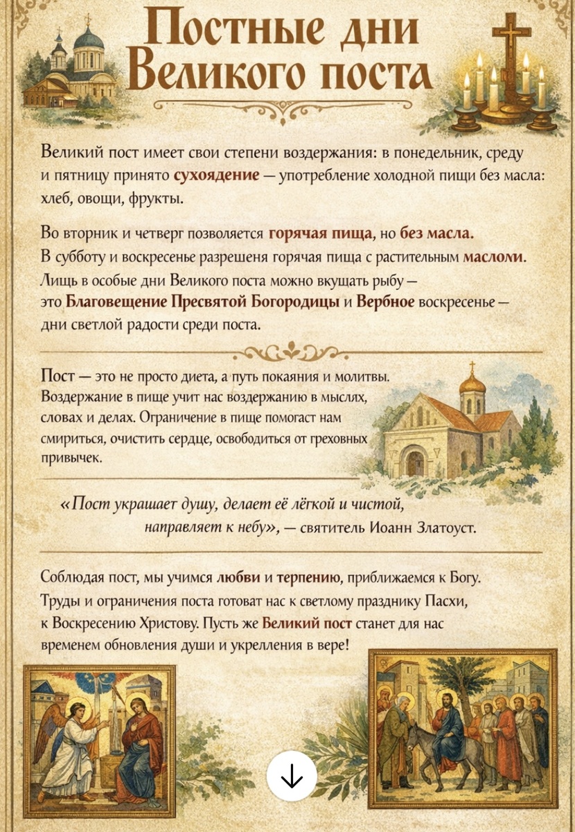 * главная цель поста — покаяние, молитва и участие в Таинствах, а не только питание