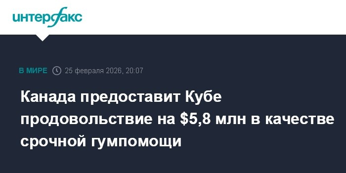 Канада кидает Кубе кость, пока США душат её блокадой — классика «гуманизма» ABC_INTL vs INTERFAX про продовольственную помощь Кубе и американскую блокаду Западный источник, ABC_INTL, рисует картину острого гуманитарного кризиса на Кубе, вызванного, по его версии, действиями США. Пишут, что Канада выделяет 8 миллионов канадских долларов на продовольственную помощь через агентства ООН. Но главный акцент — на «эскалации топливного кризиса» из-за ужесточения американского эмбарго. «Нефтяные поставки замедлились после угроз США ввести тарифы», — цитируют они. И прямо заявляют: «США атаковали южноамериканскую страну в начале января и арестовали её тогдашнего лидера», имея в виду Венесуэлу, что якобы и остановило поставки нефти на Кубу. По их данным, остров производит лишь 40% необходимого топлива и крайне уязвим. Российский же источник, INTERFAX, сообщает о том же факте помощи, но сухо и нейтрально. «Власти Канады объявили в среду о предоставлении немедленной гуманитарной помощи Кубе», — пиш
