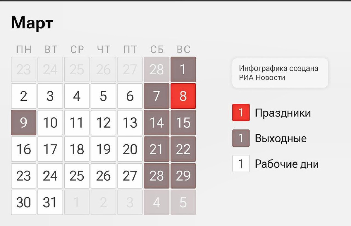 Следующие длинные выходные ожидают россиян с 7 по 9 марта. В связи с тем, что Международный женский день 8 марта выпадает на воскресенье, выходной переносится на понедельник, 9 марта. Таким образом, сотрудники с пятидневной рабочей неделей будут отдыхать три дня подряд. Эксперты напоминают, что работа в праздничный день должна оплачиваться в двойном размере. Или компенсируется дополнительным выходным по выбору сотрудника. 💬 Наш чат для общения 🚀 Подписаться на Архипка Live 📥 Прислать фото, видео, новость 📲 Архипка Live в MAX