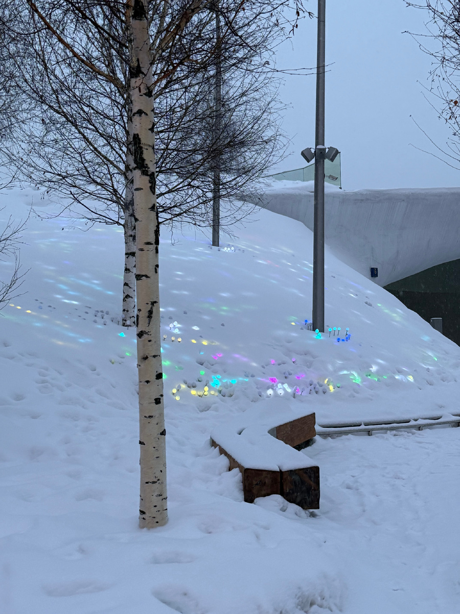 Подошли поближе - да, они, фонарики, светят из-под снега, да ещё и меняют цвета.