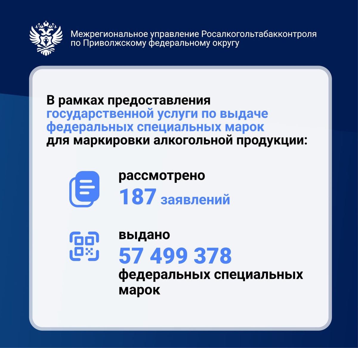 услуги по выдаче федеральных специальных марок для маркировки алкогольной продукции рассмотрено 187 заявлений и выдано 57 499 378 федеральных специальных марок. 📘 Подробный отчёт о результатах работы Межрегионального управления Росалкогольтабакконтроля по Приволжскому федеральному округу за январь 2026 года доступен на сайте. #ПФО Росалкогольтабакконтроль МАХ | ВКонтакте | Telegram