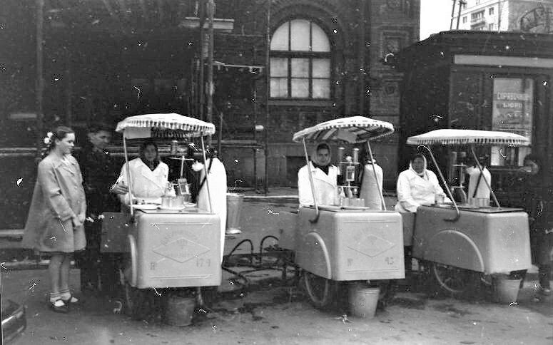 Всезнающий Интернет подсказывает, что эта фотография сделана 1 мая 1954 года. Оттепель уже началась, но Первомай в том году выдался прохладным. Впрочем, когда это у нас москвичи и гости столицы отказывались от стаканчика газировки с сиропом или без или самого лучшего пломбира. Тем более в праздник, после демонстрации. Столько продавщиц в одном месте ведь стоит в первомайский день недаром. Это Москва, площадь Революции, я так понимаю, после парада. Если правильно сориентировался по фотографии, то за спиной у продавщиц – музей Ленина, тот самый, про который Михалков написал "...В воскресный день с сестрой моей