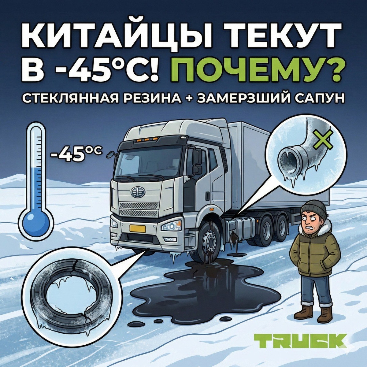 ? Сейчас трассы Севера забиты «китайцами». Машины мощные, современные, но у них есть серьезная ахиллесова пята — резинотехнические изделия (РТИ). Как только давит -45°C, сальники коленвала, ступиц и хвостовиков начинают буквально «рыдать» маслом. Почему новые тягачи не держат якутский мороз? 👇 🧊 1. «Стеклянная» резина (NBR) На конвейере в Азии часто ставят сальники из стандартного нитрильного каучука (NBR). Для климата Китая или юга РФ этого хватает. Но в Якутии при -40°C эта резина проходит точку стеклования. Она дубеет, теряет эластичность и перестает облегать вал. Густое холодное масло просто выдавливается наружу через микрощели. 💨 2. Перемерзание сапуна На многих «китайцах» неудачно реализована вентиляция картера. Трубка сапуна на трассе быстро перемерзает конденсатом. Картерным газам некуда выходить, внутреннее давление резко скачет — и мотор выплевывает даже целый сальник. 🛠 3. Ошибка при замене (Замена шила на мыло) Самая большая ошибка — менять потекший сальник на тако