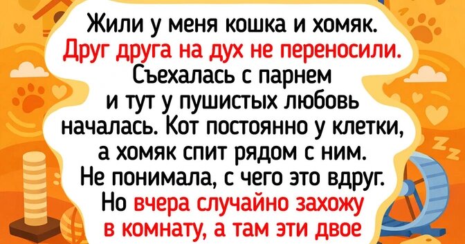 - Жили у меня кошка и хомяк. Друг друга на дух не переносили. Съехалась с парнем — и тут у пушистых любовь началась. Кот постоянно у клетки, хомяк спит рядом с ним. Не понимала, с чего вдруг. Оказывается, парень переставил клетку хомяка поближе к батарее, чтобы тот не мёрз. Кот просёк, где самое тёплое место, и притащился греть пузо. Хомяк понял, что если прижаться к прутьям — меховой бок кота работает как идеальная грелка. Теперь круглосуточно делят этот угол, боюсь лишний раз форточку открыть, чтобы не разрушить союз.