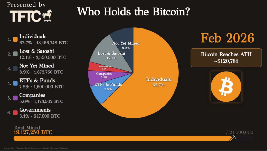 За 2025 год произошёл заметный переток биткоинов от частных инвесторов к институциональным игрокам. Компании, фонды и правительства приобрели 829 тыс. BTC, в то время как розничные инвесторы продали 629 тыс. BTC.