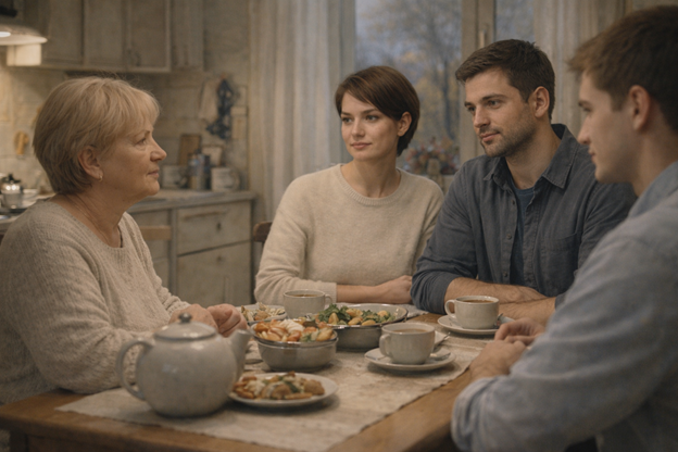 Борис Иванович за ужином был в ударе - рассказывал истории, смешил всех, и Дима смеялся, и Женя смеялась, и Артем, который обычно сдерживался, тоже хохотал в какой-то момент. Нина Петровна сидела и смотрела на этот стол - на мужа, на сына, на дочь, на Диму - и думала, что вот же оно. Всё здесь. Всё правильно.