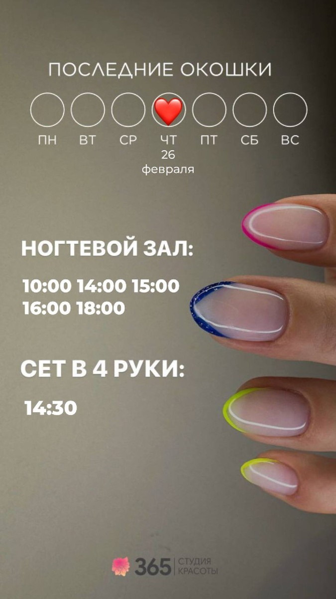 🤍 Рады видеть Вас в студии 365! На прекрасном празднике для вас Клиентский день - сжигаем зиму красиво🔥💅🤩. Приходите насладиться теплом уютом и красотой!!!🫶😁 #красота #наслаждение #забота #зима #любовь #мечты сбываются #радость #возможности ЧТО МОЖНО УСПЕТЬ СДЕЛАТЬ 26 февраля 2026 года : Ногтевой зал: 10:00 14:00 15:00 16:00 18:00 Сет в 4 руки: 14:30 Парикмахерский зал: 13:30 Оформление бровей и ресниц: ближайшая запись на 27 февраля Косметология/шугаринг: ближайшая запись на на 27 февраля ЗАПИСАТЬСЯ МОЖНО ЛЮБЫМ УДОБНЫМ СПОСОБОМ: 👉🏻 Сообщение в Whats'app https://wa.me/79663654477 👉🏻По телефону +79663654477 👉🏻Онлайн запись https://n286444.yclients.com/ #команда365 #красота #наслаждение #забота #зима #февраль #любовь #мечтысбываются #радость #возможность