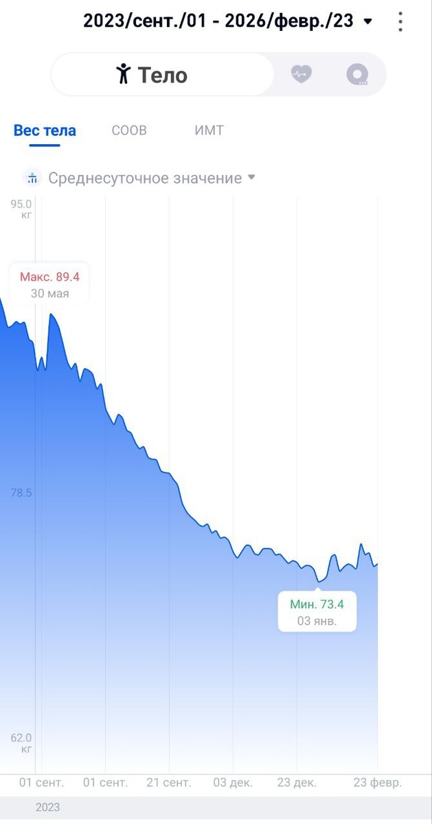 Мои весы мне намекают, что кажется, я иногда двигаюсь в противоположную сторону от моей цели. Напомню для тех, кто читает впервые, что я, обычная женщина 45 лет, с двумя детьми и лишним весом, профессионально спортом не занималась, но сейчас хочу подготовиться к прохождению начальной дистанции триатлона. Для этого обозначила себе такие цели: - проплыть 500 м максимум за 12.5 минут, можно быстрее - проехать на велосипеде 20 км за 40 минут или быстрее - и пробежать 5 км за 25 минут или быстрее - сбросить вес до 65-68 кг Часть пути уже пройдена, осталось немного! Первый старт 31 мая, на котором будет видно, насколько я достигла этих целей. Ниже на фото график моего снижения веса с 2023 года. Не всегда я взвешивалась регулярно, поэтому на некоторых участках график ровно и красиво идет вниз. Но на самом деле, всегда были колебания веса - два шага вперед, один назад, типа такого. В конце прошлого года я скурпулезно подсчитывала с помощью приложений, сколько калорий потратила и сколько съел