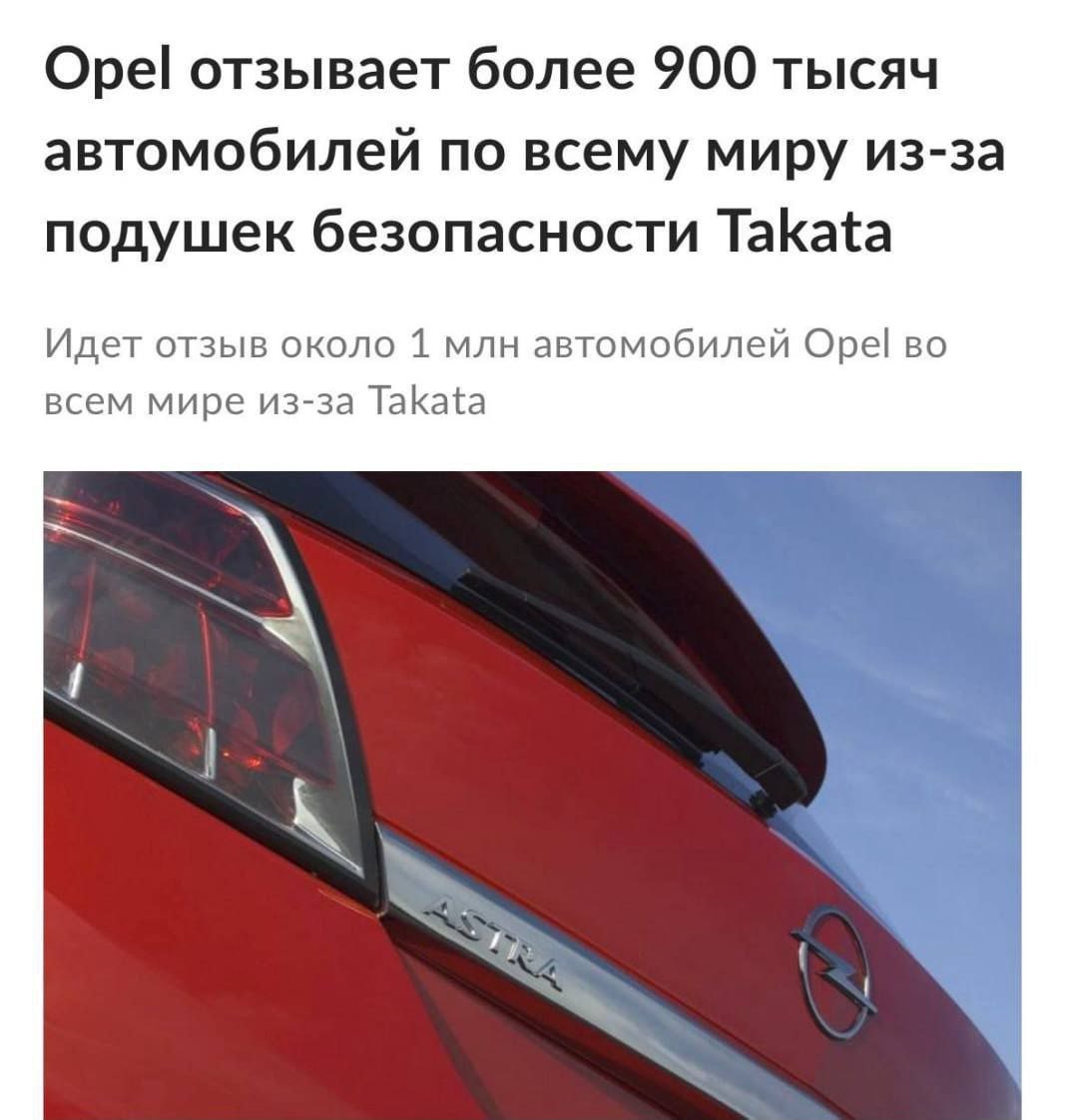 » Речь о моделях Astra, Mokka, Zafira, Vectra, Cascada, Meriva и Signum с 2003 по 2018 год В них установлены подушки Takata с нитратом аммония: со временем вещество теряет стабильность, и при срабатывании подушка может разлететься осколками металла По разным оценкам, из-за таких подушек по всему миру уже погибло около 40 человек